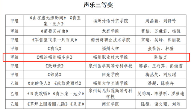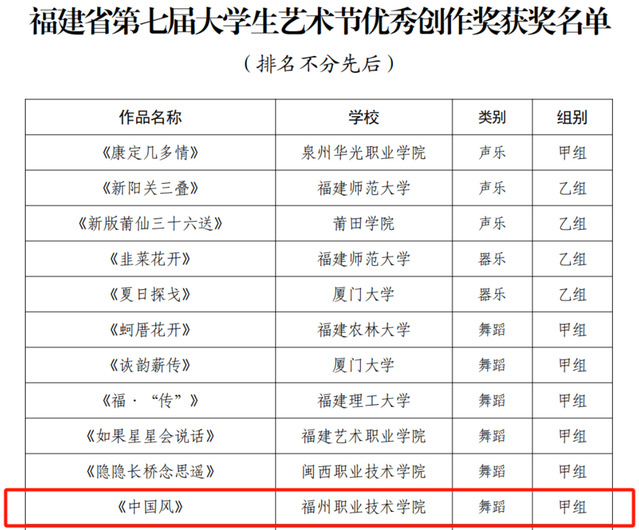 近日,福建省教育厅公布了福建省第七届大学生艺术节获奖名单。我校在此次比赛中取得优异成绩,舞蹈《中国风》荣获舞蹈组一等奖和优秀创作奖,朗诵《等待》荣获朗诵组三等奖,伬艺联唱《福连福州福多多》荣获声乐组三等奖,我校选送的艺术表演节目全部获奖。