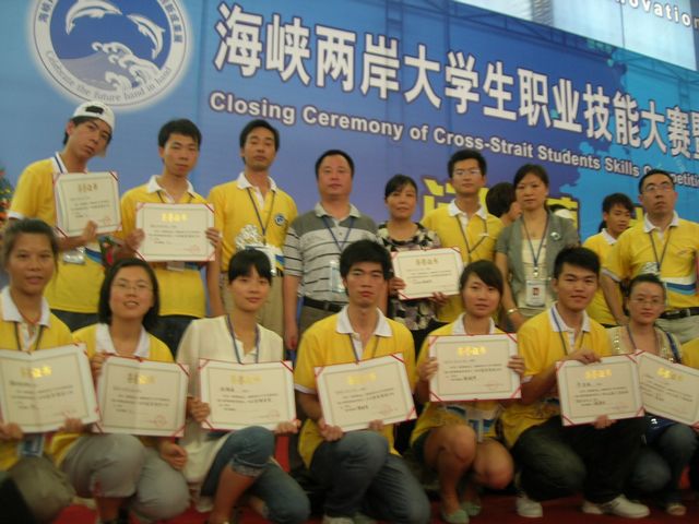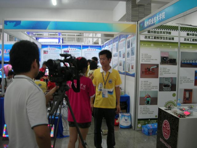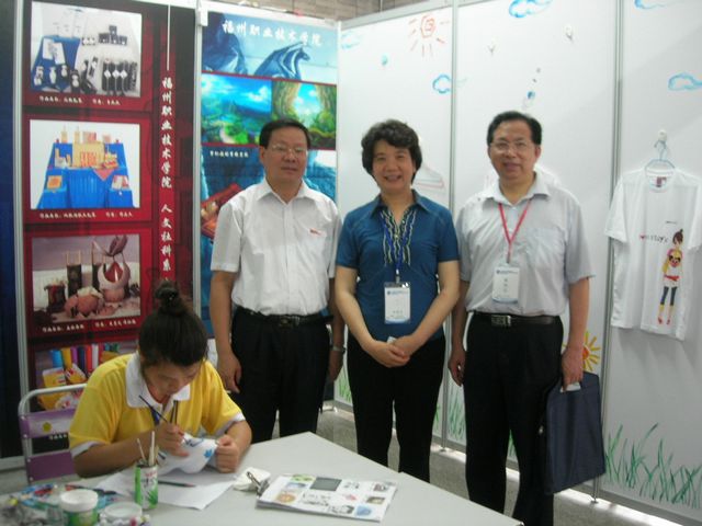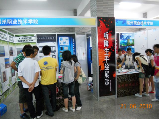 我院参加第二届海峡论坛:海峡两岸大学生职业技能大赛暨创新成果展全体人员,我院创新成果展参展展位,詹碧卿副院长与兄弟院校领导合影,听障生汪秀儿向台湾院校赠送手绘作品,省内高职院校首个专利获得者陈相德接受采访,学院与台湾大叶大学、永达职业技术学院联谊,我院参赛师生成绩喜人