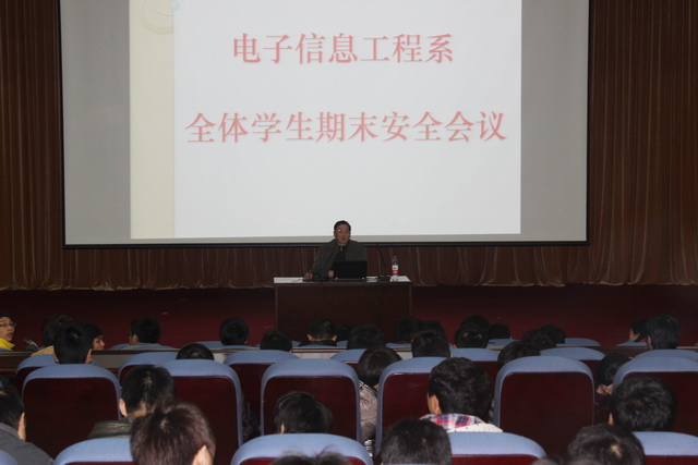 2013年1月14日下午,电子信息工程系全体学生在500人大厅召开了全系学生期末安全会议,参加会议的有系党总支书记李伟建、系副主任叶晓星、辅导员、学生两委干部及全体学生。