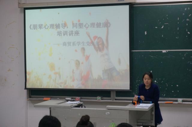 2016年3月25日,商贸系开展了朋辈心理辅导的培训讲座,该项目是商贸系学生党支部“朋辈心理辅导,同塑心理健康”立项活动之一,旨在提升学生的心理素质和专业技能。讲座邀请了学院阳光心理之家导师赵琳琳到场开讲。商贸系学生党员、二级心理辅导站全体成员参加了讲座。