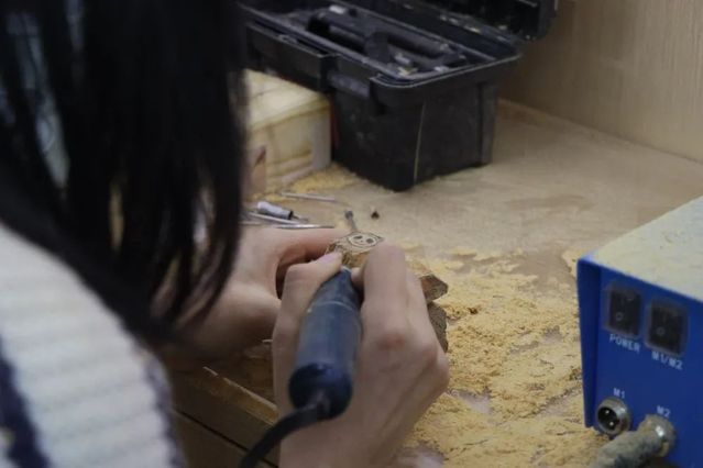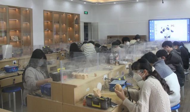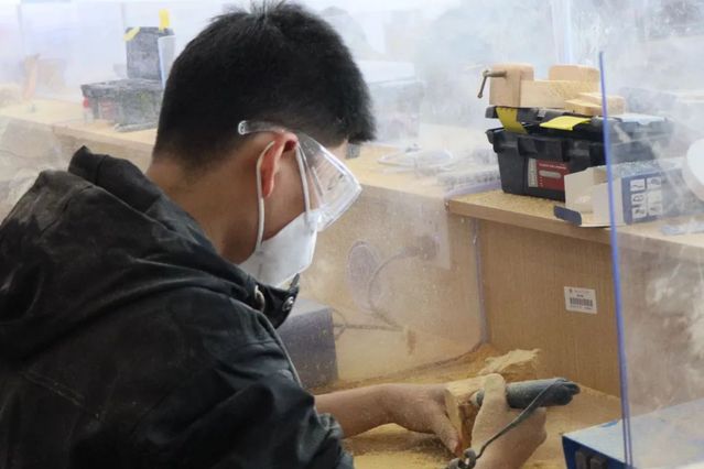 同学们在余春洲的指导下,深入了解木雕作品的创作立意、构图技巧和雕刻技法,以樟木、崖柏木为原材料学习自制北京冬奥会吉祥物“冰墩墩”。经过构图、粗胚、修光、打磨等工序,一只只憨态可掬的木制“冰墩墩”在同学们手中成功诞生。