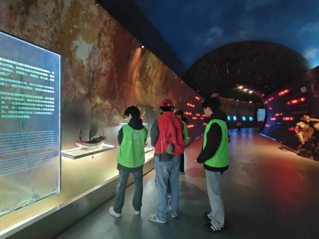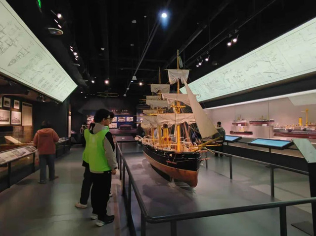 在中国船政博物馆,“船政传薪实践队”深入了解了木帆船时期的传统造船工艺、铁胁木壳船的混合材料应用,以及钢铁船体的现代工业技术,深刻感受到各个时期工匠的对技艺的执着追求、对品质的精益求精以及对创新的不懈探索。队员们还参与场馆志愿服务,协助人员分流并讲解船政历史、弘扬船政文化。在船政时光隧道,队员们沉浸式探索马尾船政的辉煌历史,学习马尾船政在工业、科技和建筑领域的成就。从“平远”号军舰模型到马尾福建船政建筑群图片,队员们感受到船政人的智慧与中西文化的交融,深刻领悟了“爱国、科学、创新、图强”的船政精神。