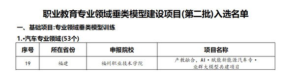 近日,教育部公布了第二批职业教育专业领域垂类模型建设项目入选名单,福州职业技术学院交通工程学院申报的“产教融合,AI赋能新能源汽车专业群大模型共建项目”成功入选汽车专业领域基础项目。