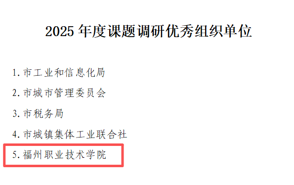 近日,福州市人民政府发展研究中心发布《关于2025年度市政府系统优秀调研课题评审结果的通报》,我校在本次评审中表现突出,喜获多项荣誉:学校被授予“2025年度课题调研优秀组织单位”称号;刘春兰同志团队的课题《关于加强我市全域旅游宣传体系建设的思考》荣获“2025年度优秀调研成果奖”;张高云同志荣获“2025年度课题调研先进个人”。