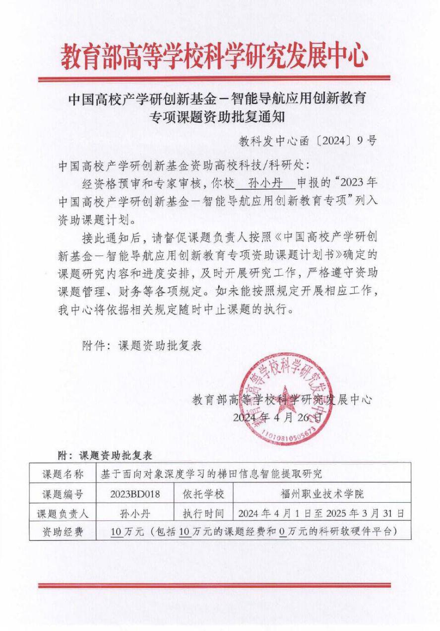 近日,教育部高等学校科学研究发展中心发布了关于“2023年中国高校产学研创新基金-智能导航应用创新教育专项”课题资助的通知。信息工程学院孙小丹老师主持的《基于面向对象深度学习的梯田信息智能提取研究》获立项,并成功获得10万元课题经费资助!