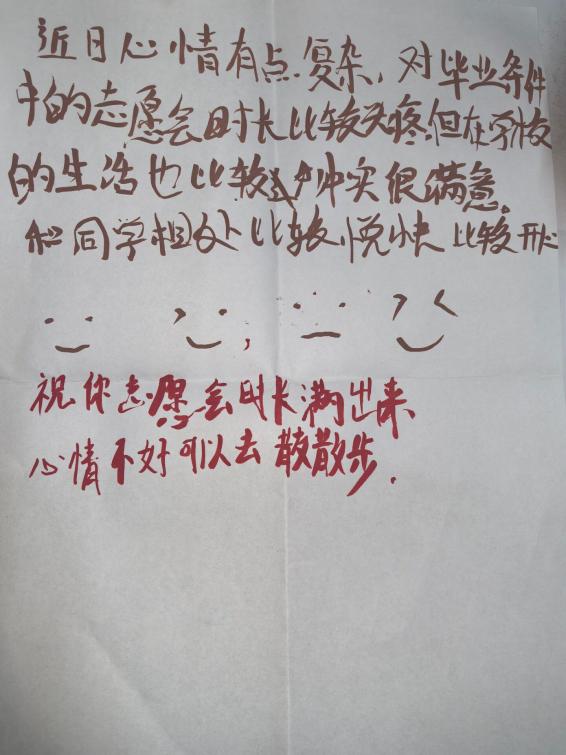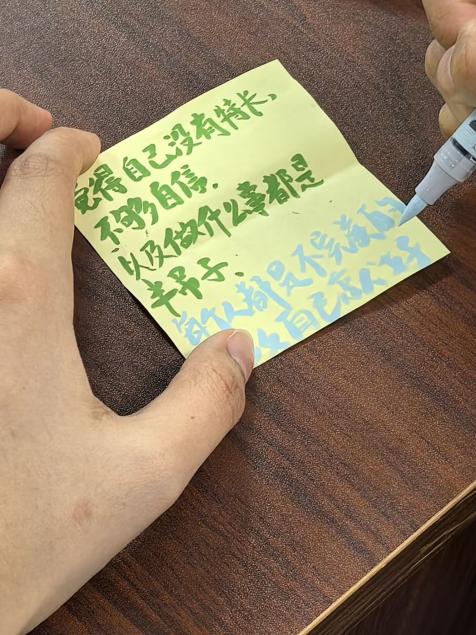 活动开始,同学们在工作人员引导下,前往心情纸条制作区。现场备有空白 A4 纸、彩笔及贴纸,大家拿起笔,在便签纸上书写心情故事、烦恼、愿望或鼓励话语,并精心装饰,以独特方式尽情表达,创作过程轻松愉悦,有效舒缓压力。