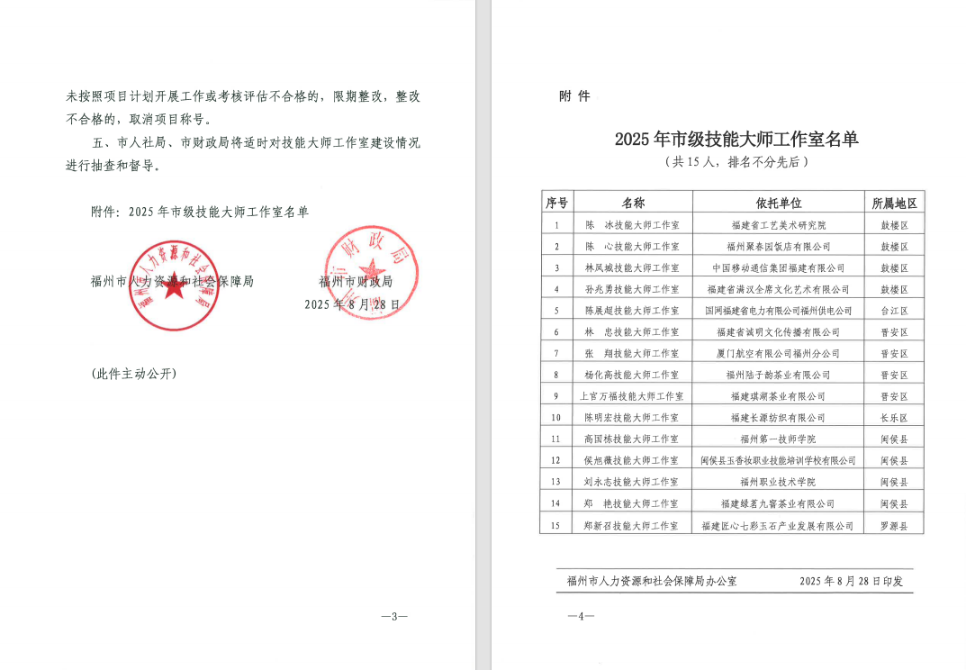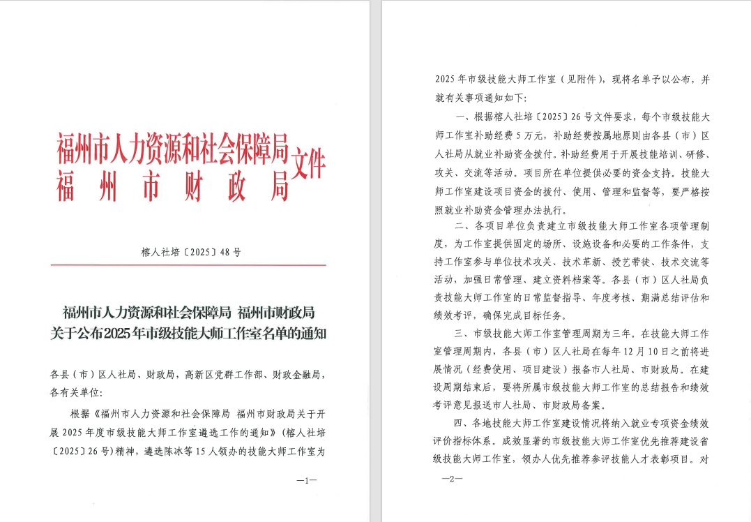 近日,福州人力资源和社会保障局、福州市财政局《关于公布2025年市技能大师工作室名单的通知》榕人社培[2025]48号,信息工程学院刘永志老师成功入选。