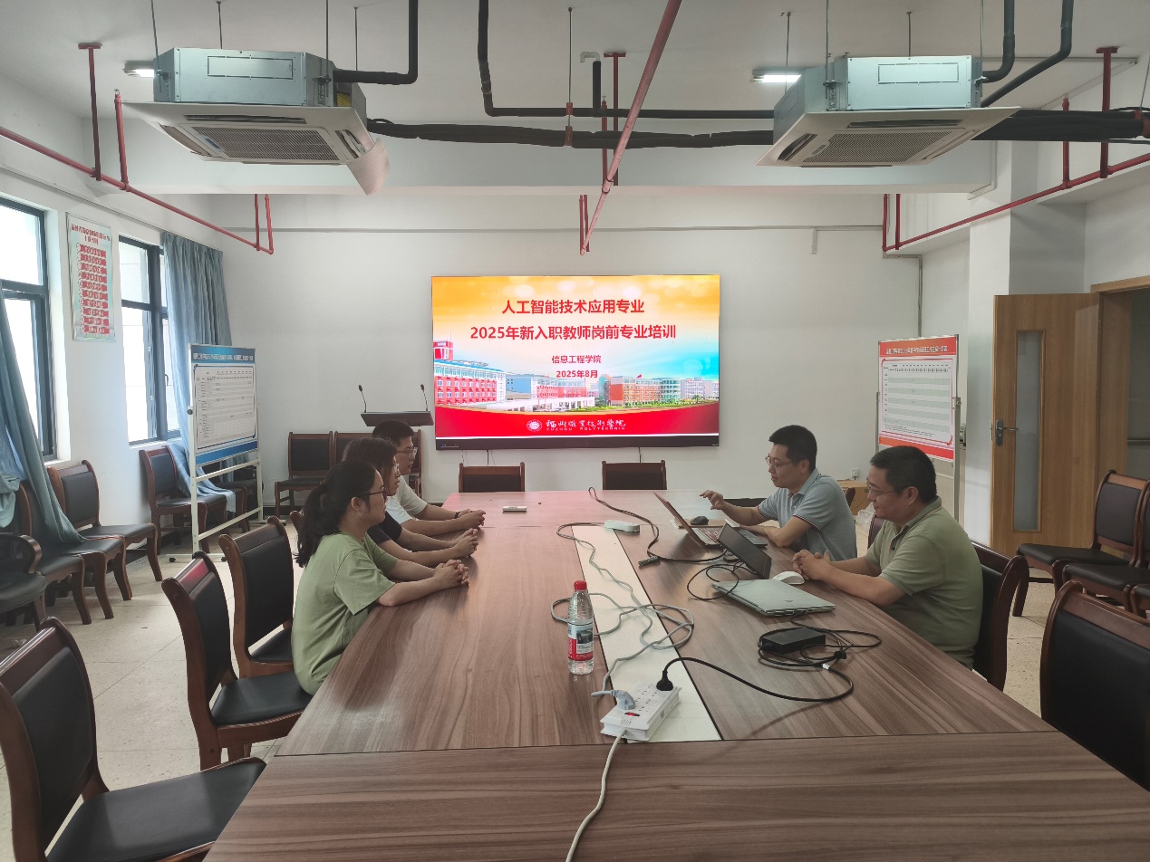 2025年8月28日下午2点在爱心楼606信息工程学院会议室人工智能技术应用专业对2025年新入职教师进行岗前专业培训。会议由副院长蒋伟杰博士主讲,人工智能专业全体教师参加。