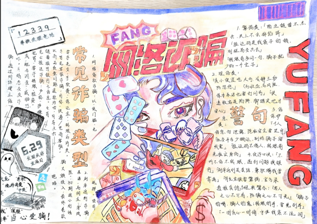 当前电信网络诈骗手段持续翻新,骗局隐蔽性与迷惑性增强。本次活动紧密结合学生日常生活场景,聚焦刷单返利、冒充客服、游戏账号交易等高发骗局,鼓励学生将专业知识与防诈常识相结合。活动期间,同学们踊跃参与,利用课余时间搜集案例、设计版式,通过图文并茂的形式呈现防诈要点,创作出一批主题鲜明、内容实用、形式多样的优秀作品。