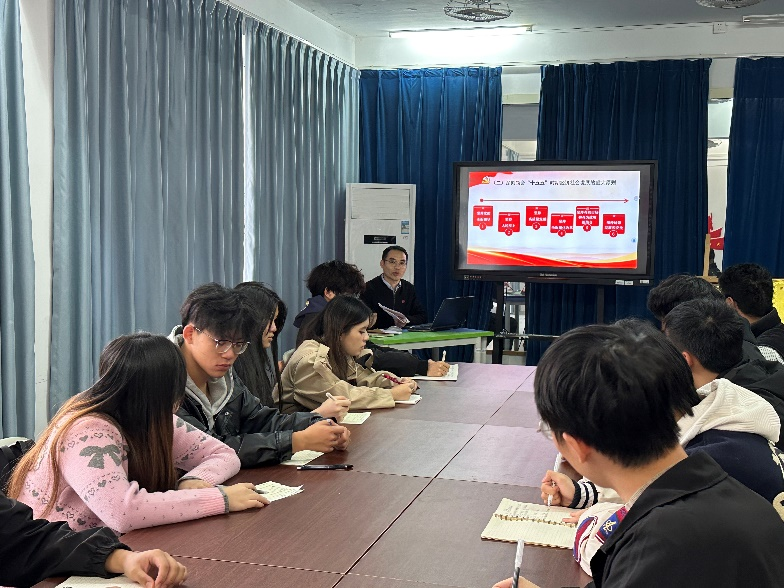 会上,卢元文副书记从历史背景、战略部署、青年责任三个维度,系统阐释了全会的重大意义,重点解读了全会中与青年发展密切相关的政策方向。他强调:"全院师生要将学习贯彻党的二十届四中全会精神作为当前和今后一段时间的重要政治任务,把个人规划融入国家发展大局,在服务国家战略需求中实现人生价值。团总支书记王龙宗结合共青团工作实际,号召全体学生干部率先垂范,通过“支部领学+朋辈互学”模式带动身边同学深学细悟,并将全会精神转化为参与学科竞赛、社会实践、志愿服务等具体行动,在知行合一中锤炼过硬本领。