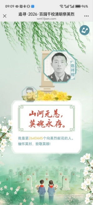 线下活动现场,同学们以小组为单位参与清明诗词飞花令与清明习俗猜谜两大环节。大家围绕 “清”“明”“春” 等关键词吟诵经典诗句,在抢答互动中学习踏青、祭扫、食青团、插柳等传统习俗,在轻松愉悦的氛围里感受中华优秀传统文化的魅力。线上祭英烈活动,同学们通过网络敬献鲜花、书写寄语、云端追思等方式,缅怀革命先烈的英勇事迹,表达对英烈的崇高敬意与深切哀思,将缅怀之情转化为奋进力量。