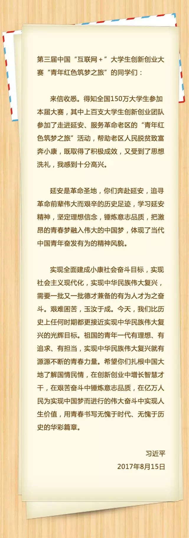 习近平总书记给第三届中国“互联网+”大学生创新创业大赛“青年红色筑梦之旅”的大学生的回信: