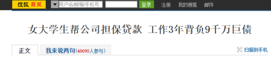 2015年,一则《女大学生工作三年,背上9000万巨债》的新闻在社会上引起的轩然大波,女大学生的欠款从何而来?她的欠债额度为什么会如此之高?记者们深入调查之后发现,这名女大学生做了公司的自然担保人,受公司老板和信贷经理联合游说,为公司9000万的巨额贷款作了担保人,公司倒闭,但这名女大学的债务却很可能跟着她一辈子。