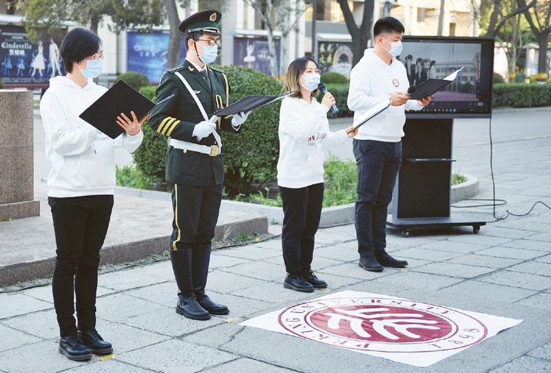 2020年3月23日,北京大学的师生在“让青春在党和人民最需要的地方绽放绚丽之花”为主题的升旗仪式上进行诗朗诵。新华社记者 张晨霖/摄