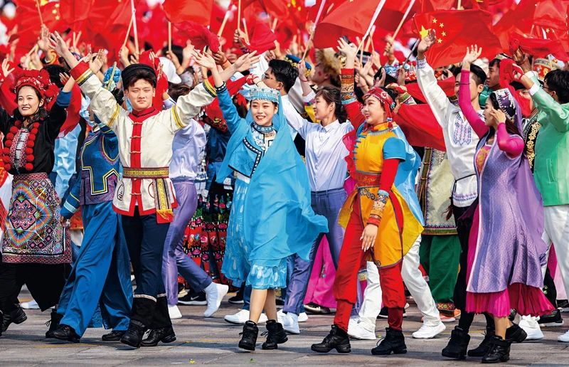 2019年10月1日,在庆祝中华人民共和国成立70周年群众游行队伍中,身着民族盛装的青年们热情挥手。中国青年报·中国青年网记者 李隽辉/摄