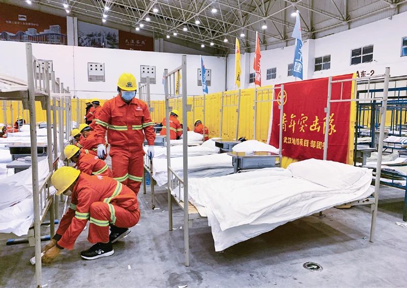 2020年2月6日,共青团组织武汉地铁青年突击队抢建武汉客厅“方舱医院”。共青团中央供图 章旭/摄