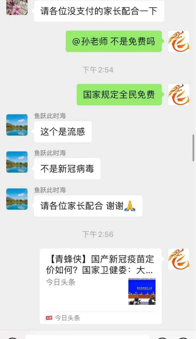 1月3日下午,在一所中学某班级的家长QQ群里,“班主任”突然发消息说“学校要收新冠疫苗接种费”。一些家长看到“班主任”的通知后,立即按要求转去“疫苗费”。随后,有家长电话联系班主任得知,此为诈骗事件。此时,已有多名家长被骗。