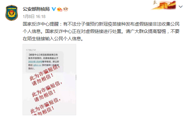 近日,多地市民收到假借官方机构名义发出的诈骗短信↓↓要求市民点击链接预约接种新冠疫苗。“【疾管中心】新冠疫苗政策已在我市开放预约,名额有限截止于2020年1月8号暂停报名,请立即前往xxx.cc预约接种(含家庭预约)。”