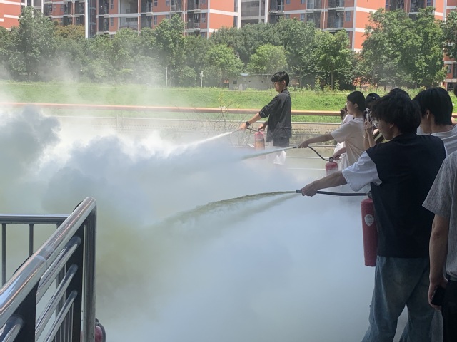 疏散环节结束后,现场教学进入实操阶段。消防维保专业人员化身“安全导师”,对灭火器和消火栓的使用方法进行细致讲解与标准示范。在专业指导下,师生与实训室工作人员热情高涨,纷纷主动上前,亲身体验使用灭火器扑灭模拟火源。一次次规范的操作、一个个成功灭火的瞬间,让大家在实践中切实掌握了关键的灭火技能。