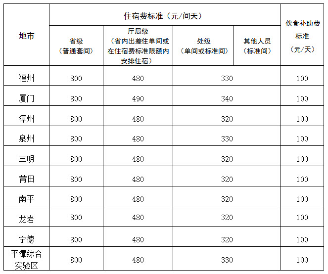 第十二条 省财政厅分地区制定省内出差住宿费限额标准。各设区市财政局、平潭综合实验区财政金融局根据当地经济社会发展水平、市场价格、消费水平等因素,提出所在市住宿费限额标准报省财政厅,经省财政厅统筹研究提出意见反馈地方审核确认后,由省财政厅统一发布作为省直单位工作人员到省内相关地区出差的住宿费限额标准(见附件1)。