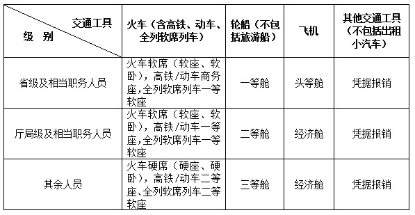 第七条 出差人员应当按规定等级乘坐交通工具。乘坐交通工具的等级见下表: