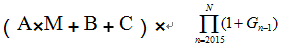 其中:A为2014年9月工作人员本人的基本工资标准;B为2014年9月工作人员本人的职务职级(技术职称)等对应的退休补贴标准;C为按照国办发〔2015〕3号文件规定相应增加的退休费标准;M为工作人员退休时工作年限对应的老办法计发比例;Gn-1为参考第n-1年在岗职工工资增长等因素确定的工资增长率,n∈〔2015,N〕,且G2014=0;N为过渡期内退休人员的退休年度,N∈〔2015,2024〕,2014年10月1日至2014年12月31日期间退休的,其退休年度视同为2015年。