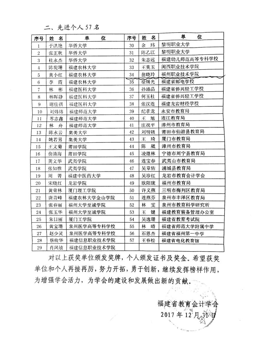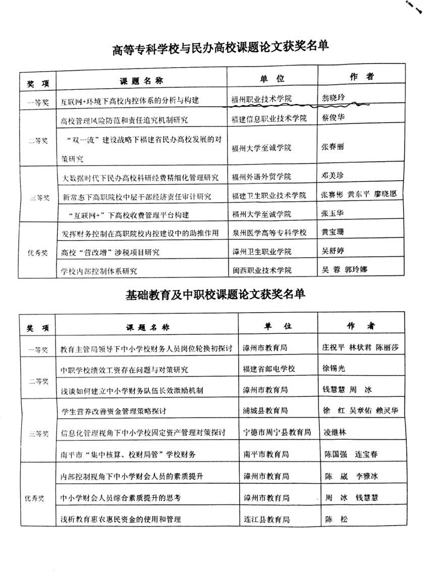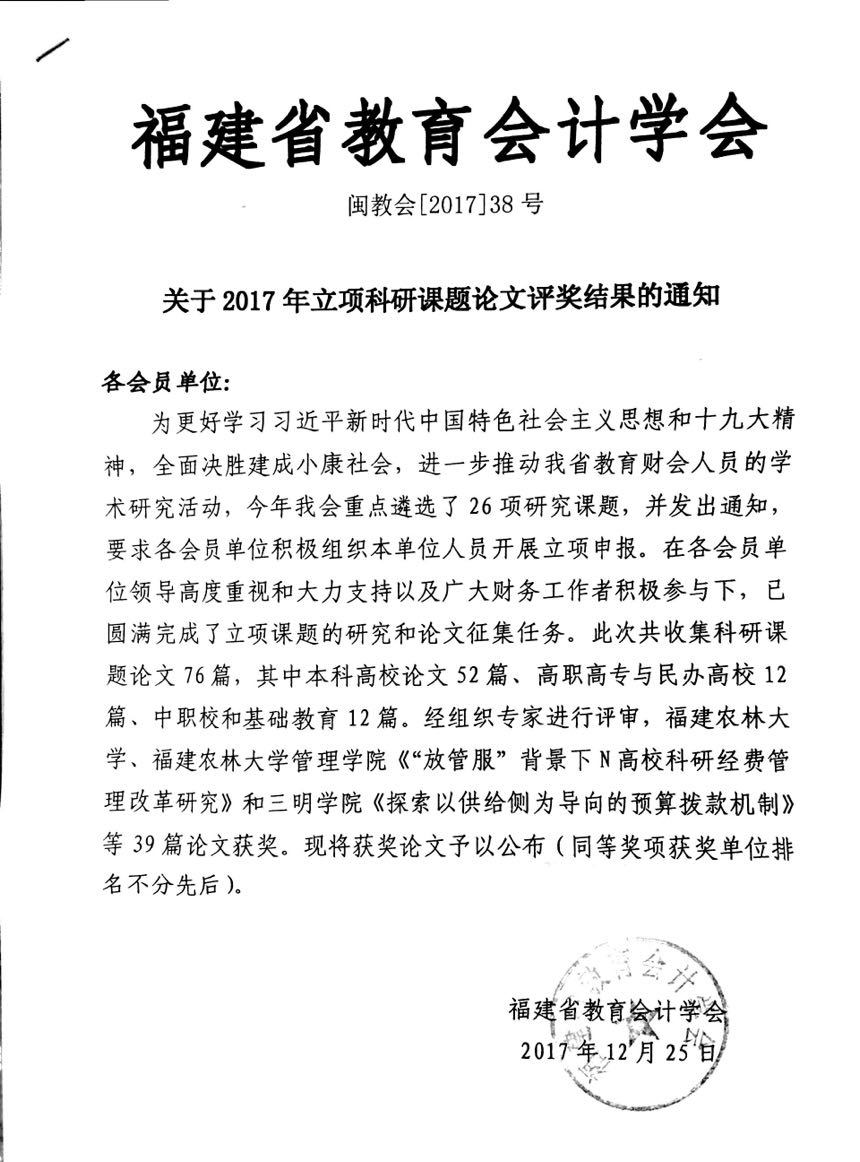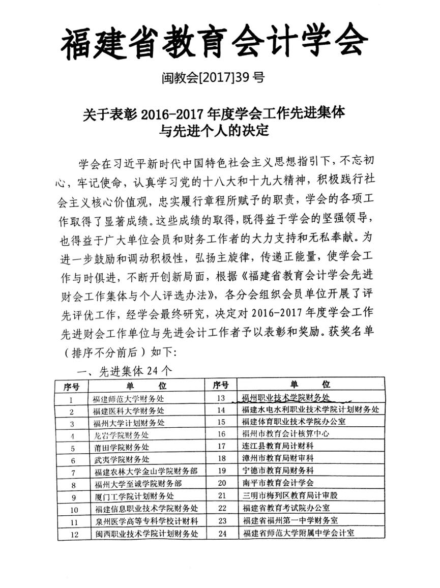日前学校收到福建省教育会计学会《关于表彰2016-2017年度学会工作先进集体与先进个人的决定》(闽教会〔2017〕39号)和《关于2017年立项科研课题论文评奖结果的通知》(闽教会〔2017〕38号)。我校财务处紧跟国家财政政策变化,加强财务管理、创新工作思路、开展科学研究,财会工作成绩突出,荣获2016-2017年度学会工作先进集体称号,财务处副处长、高级会计师翁晓玲荣获先进个人称号,翁晓玲老师撰写的《互联网+环境下高校内控体系的分析与构建》还获得“高等专科学校与民办高校组” 课题论文一等奖,为该组仅有一个的一等奖。