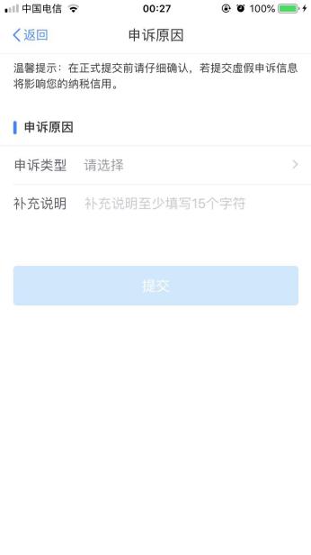 选择申诉类型并完善补充说明,补充说明需大于15个字符,确认填写信息真实有效点击【提交】。