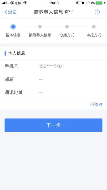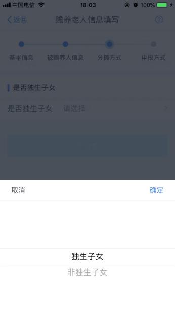 选择是否独生子女。独生子女,分配比例为全部由本人扣除;非独生子女,需录入共同赡养人、本年度月扣除额并选择分摊方式(赡养人平均分摊、赡养人约定分摊、被赡养人指定分摊),点击下一步;