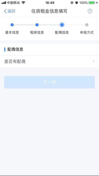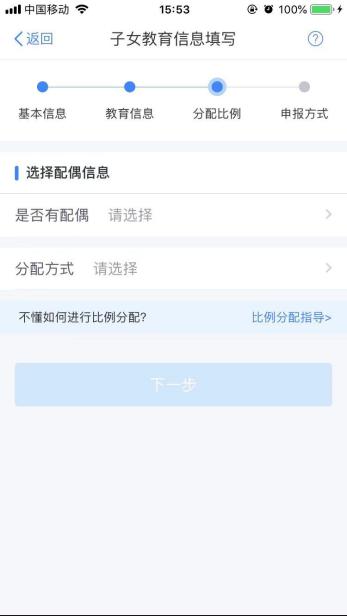 选择是否有配偶和分配方式,若之前未添加过配偶信息选择“有配偶”后可以在该页面先添加配偶信息,点击【下一步】;