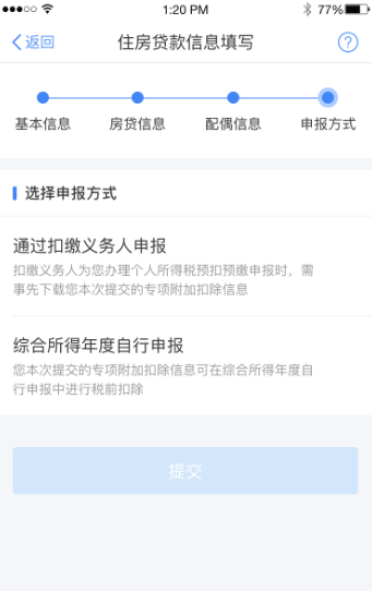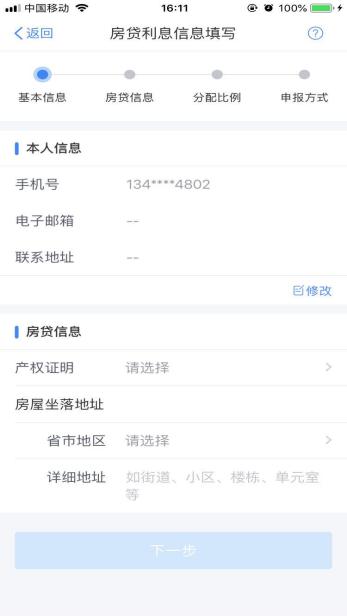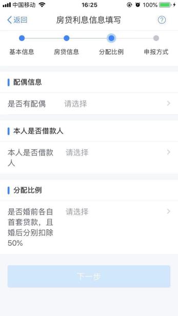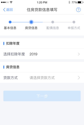 选择扣除年度以及贷款方式。贷款方式分为公积金贷款、商业贷款、组合贷三种,至少填写其中一项点击【下一步】;