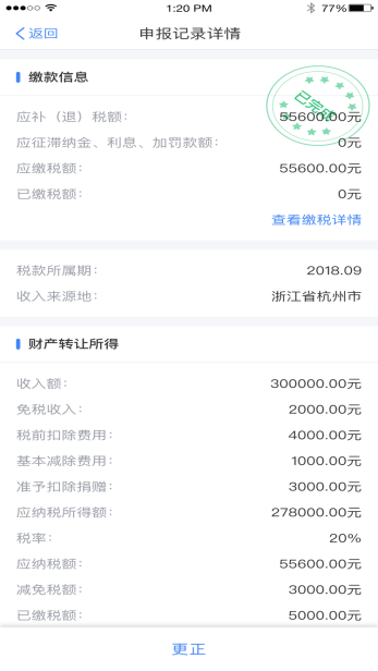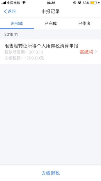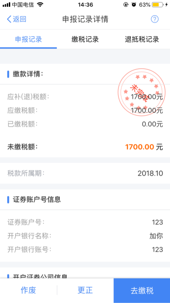 未完成页面里显示已提交成功未缴款或已提交成功需退税的报表记录,点击对应报表可查看到该表的具体收入和缴款信息,可进行【缴款】、【更正】、【作废】报表操作;