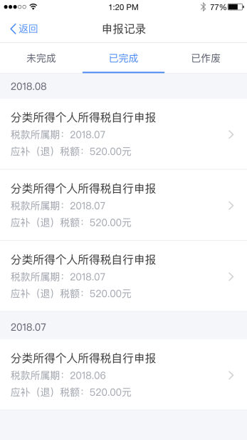 本功能用于查询您的报表申报记录,包含未完成、已完成、已作废的申报表相关信息。