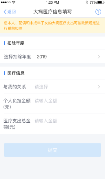 选择扣除年度、与您的关系,据实录入个人负担金额以及医疗支出总金额,点击【提交】即可。
