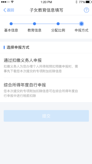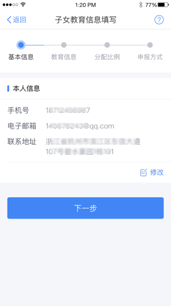 根据实际情况选择和录入子女教育信息,如当前受教育阶段、教育时间起和止等,完善后点击【下一步】;