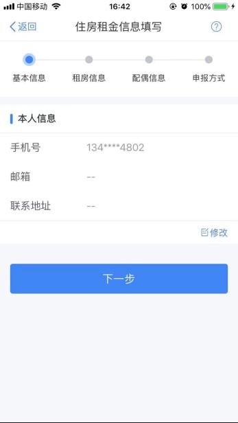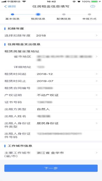 出租方类型分为自然人和组织,需要录入对应类型的出租人身份证件信息或出租单位统一社会信用代码(纳税人识别号),点击【下一步】;