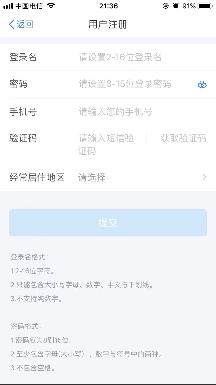 设置登录名、密码、手机号(需短信校验)完成注册;系统对登录名和密码有规则校验,设置完成后即可通过手机号/证件号码/登录名登录。