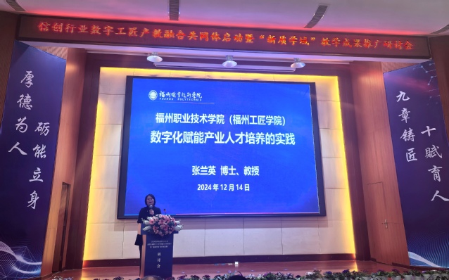 论坛交流环节,专家围绕职业院校数字工匠培养赋能新质生产力、AIGC时代院校“人工智能+”专业课程建设等主题作报告。张兰英副校长以《福州职业技术学院(福州工匠学院)数字化赋能产业人才培养的实践》为主题,介绍学校紧密对接产业经济发展,以数字化赋能教学,在产业人才培养过程中进行的探索和实践,同时分享了福州工匠学院近年来的教育教学经验。