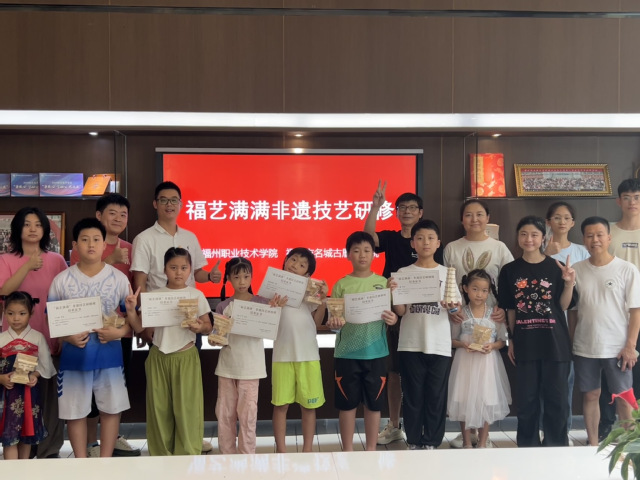 一是“政校行企”共建夯基。学院充分利用地域文化资源,牵头建设“福建省文旅创意职业教育产教联盟”,立项省级开放型闽台产教融合实践中心——“非遗技艺开放型闽台产教融合实践中心”和省级闽台融合实习实训基地——“文化旅游闽台融合实习实训基地”。与10余个省、市行业协会深度联络,并担任常务理事单位、理事单位等职能身份,探索“政校行企”联创联建新思路,建立“请进来学”+“走出去看”共学模式。二是大师领航育才。融合根雕、木雕、寿山石雕等传统工艺,依托陈礼忠、余春洲、杨世膺三位国家级、省级工艺美术大师创建技能大师工作室,以工作室为平台助推教师教学理念、实践水平、课程理论的改革创新,通过师傅带徒弟的形式,实现非遗文创品的传承推广和创新发展。三是党建品牌注力。以党建引领“福”文化品牌设计,将“福”文化素材融入“以文化人、以文育人”的主题党日活动中,承办两届“福文化”艺术设计作品线上线下展览。活动受到新华社、光明日报、 学习强国、福州日报等多家媒体专题报道,引起广泛关注和良好反响。目前,学院正持续推进与福州名城古厝设计院联合打造的“福艺满满”非遗技艺体验班项目,进一步传承和弘扬福建优秀传统文化。