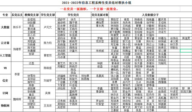2021年8月,信息工程系党总支教师党支部通过省委教育工委“省级样板支部”的考核评审,2022年3月入选第三批全国党建工作样板支部培育创建单位;2021年8月,教师党支部“双带头人”支部书记工作室获得省级培育项目立项。教师党支部在人才培养、教师思政工作、学校“双高”建设等方面做出突出贡献。学生党支部辅导员获得福建省高校思想政治教育研究会2021年优秀论文二等奖1名、三等奖1名,获得学校市域社会治理现代化理论研究优秀论文1名,辅导员与专业党员教师指导的“三创”工作在2021年第七届省“互联网+”大学生创新创业大赛中取得一银2铜的好成绩。2021届毕业生通过党员“一对一”就业帮扶,实现“双困毕业生”全就业,信息工程系获2021年度学校毕业生就业创业工作一等奖。
