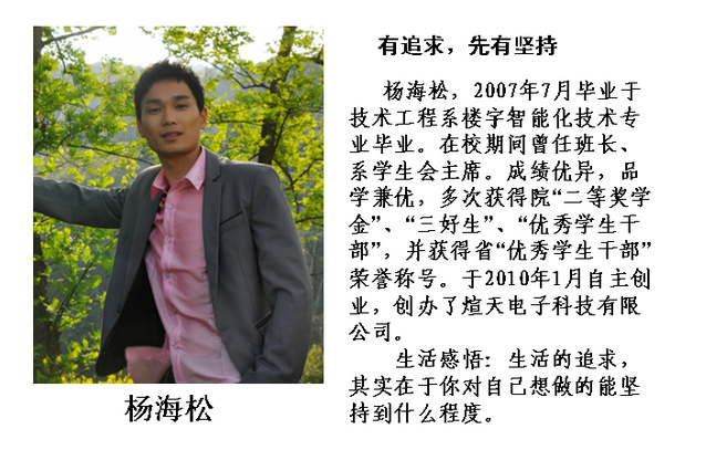 创业经历、体会及成绩(:毕业后,应聘于福州西林智搏电子技术有限公司,从事智能安防工作,钻研智能安防技术。在岗位上勤奋好学,认真积累经验,在熟练掌握该行业业务知识和运作流程后,先于2010年3月成立福州煊天电子科技有限公司,注册资金50万。主营一卡通、安防、监考和排队机业务。随着业务规模的不断扩大,杨海松又于2013年成立科融电子科技有限公司,注册资金100万。两家公司共有员工30人,年销售额500多万。他具有发挥专业特长,积极创业的精神。