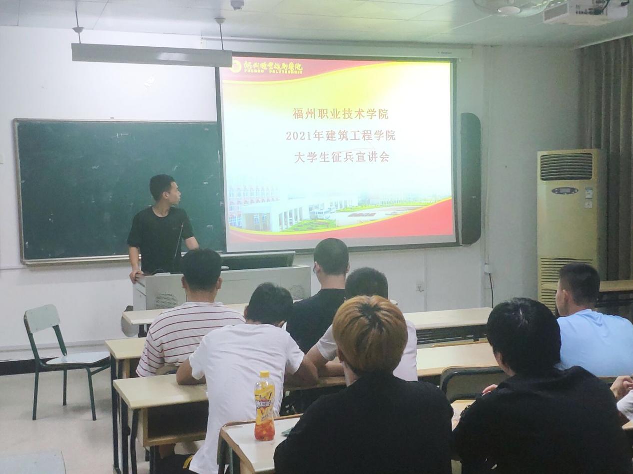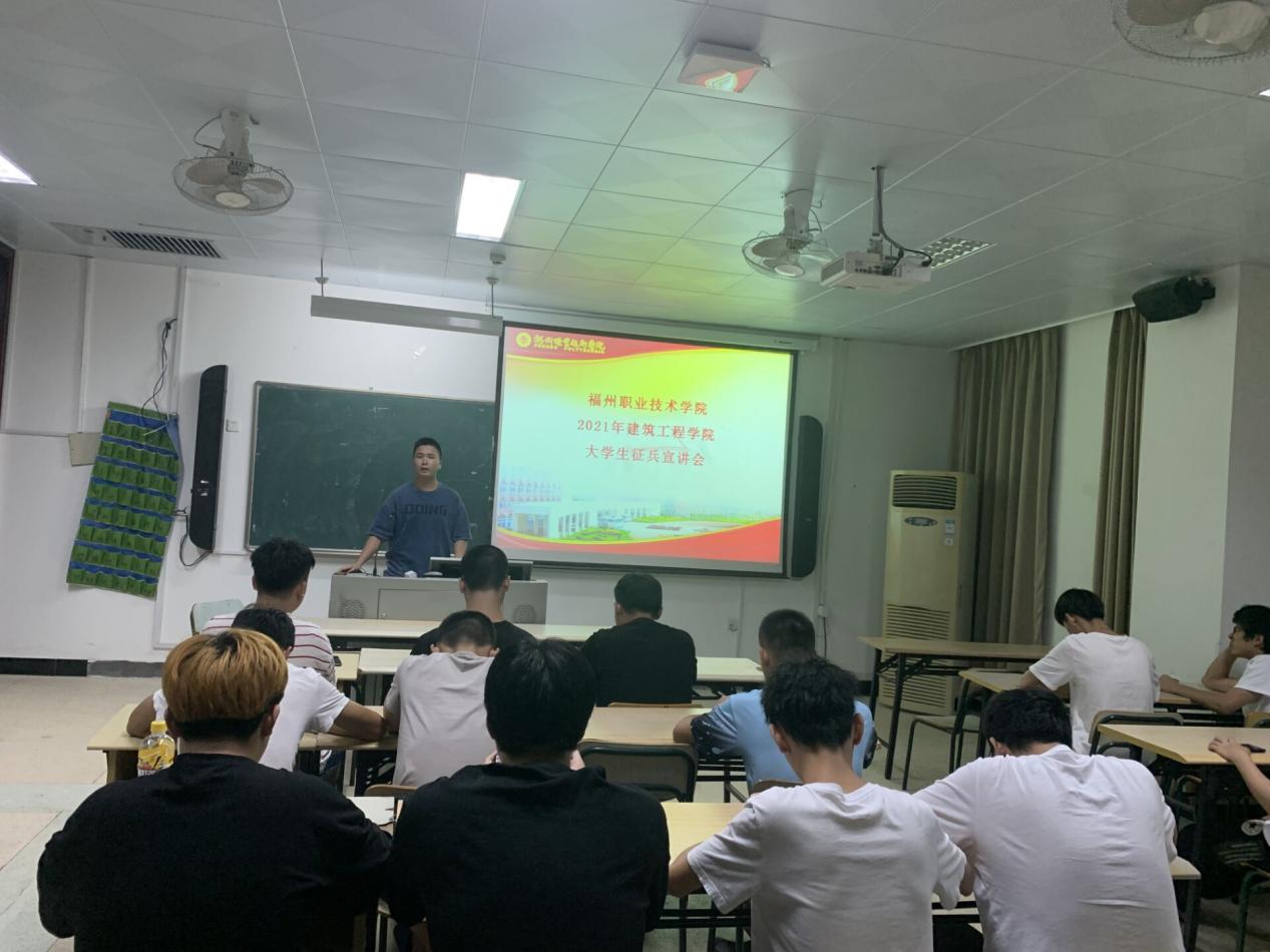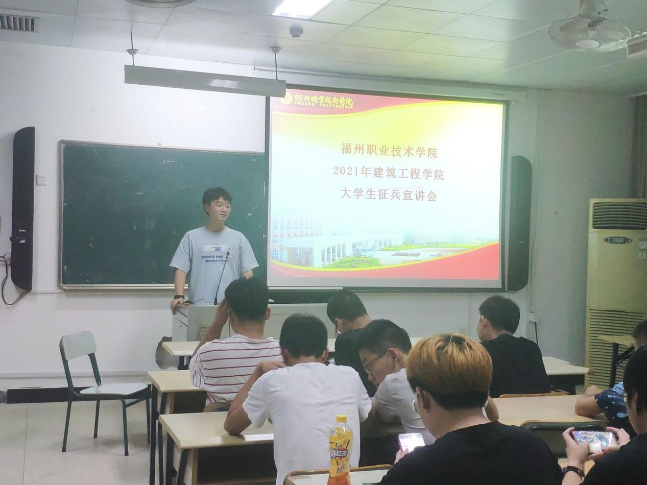 会上,首先由主持人介绍了全国整体的应征入伍的政策,以及从政治上有优待、学业上有照顾、工作上有出路和经济上有保障等方面详细介绍了福州市闽侯县征兵入伍的优惠政策。接下来由3名退役士兵学生代表分别进行了事迹宣讲:造价2019-1班的邱鑫嵘介绍了退伍后的待遇等方面的知识,电梯20五贯班的吴学凡讲述了有关他自己从新兵连到下连队的故事,以及造价2019-1班的张沐榕分享了自己在兵旅生活中所收获战友情的故事。