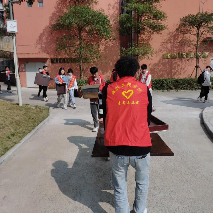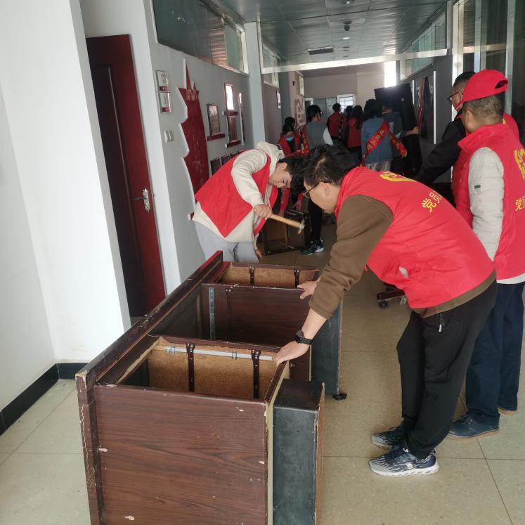 在电子大楼,建筑工程系志愿者与财务处采购与招标中心党支部党员老师志愿者们联合开展了报废桌椅拆卸和清理活动。活动中,志愿者们将劳动教育实践与志愿服务相结合,用工具将报废桌椅逐一拆卸后,分批搬运至垃圾屋内,等待垃圾清理车清运。