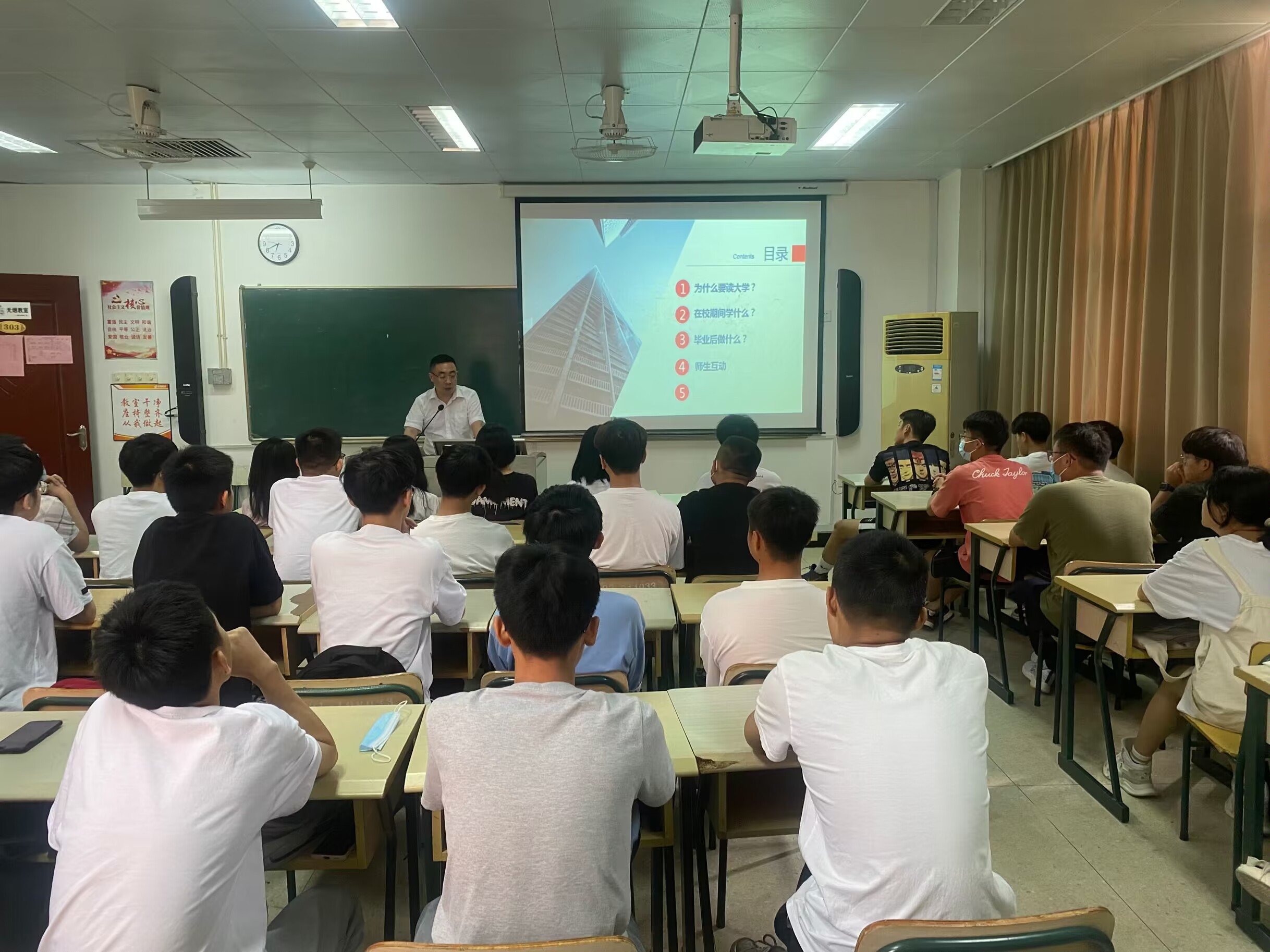 2022年9月27日上午,建筑智能化工程技术专业2022级新生专业教育在电子楼401,303教室开展。建筑工程系系主任叶晓星,系党总支副书记叶彩虹到班级讲话。系领导首先对新同学的到来表示欢迎,并对同学们提出了殷切期望,希望他们三年之后能成为高素质技术技能型人才。