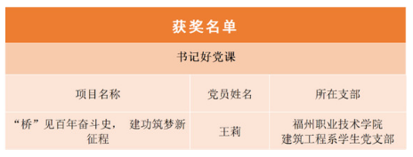 近日,中共福建省委教育工作委员会印发《关于公布高校党支部工作“立项活动”优秀成果和“党员好故事、书记好党课、支部好案例”获奖名单的通知》(闽委教组〔2022〕26号),我系学生党支部书记王莉讲授的党课《“桥”见百年奋斗史,建功筑梦新征程》入选“书记好党课”,为近年来学校唯一入选该项目的党课。