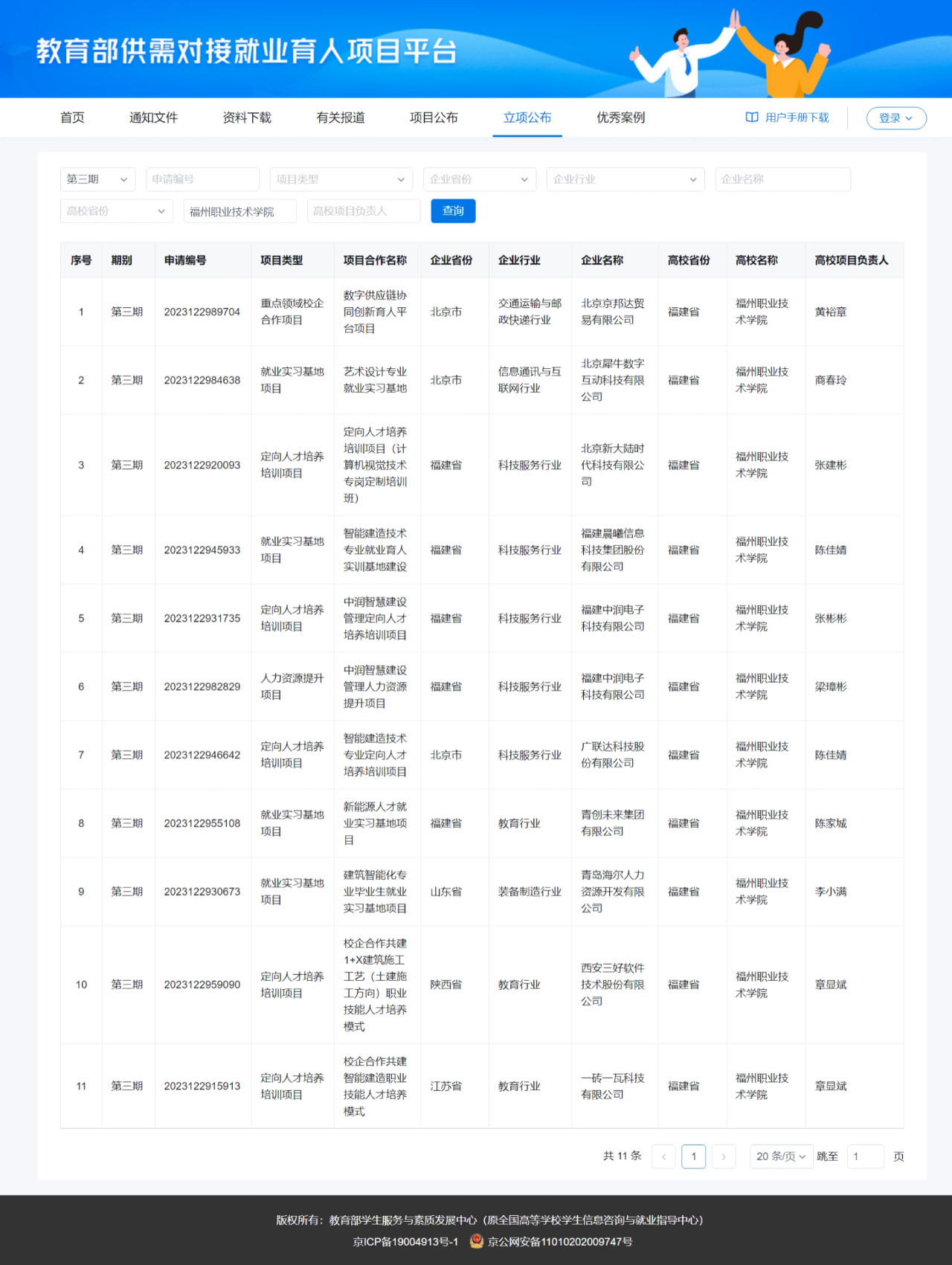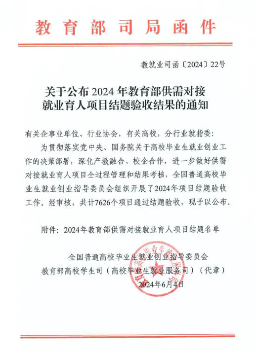 近日,教育部在供需对接就业育人项目平台发布了第三期项目立项信息,并印发了《关于公布2024年教育部供需对接就业育人项目结题验收结果的通知》。我院7个项目获教育部供需对接就业育人项目立项(第三期),1个项目顺利通过结题验收。