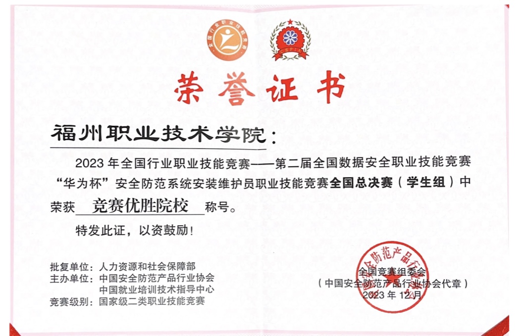 会议还对2023年全国安防行业职业技能竞赛全国总决赛中表现突出的单位和选手进行了表彰。我校以其卓越的表现荣获了福建省唯一的“竞赛优胜院校”称号。建筑工程学院建筑智能化工程技术专业2021级2班张金烽和张堂杰同学,分别荣获了“安防系统安装维护员”二等奖和三等奖。