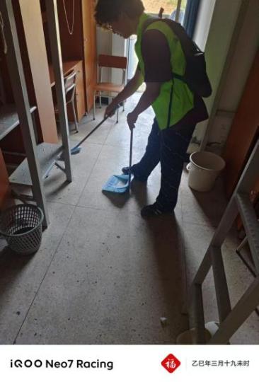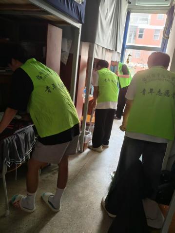在扬帆社区党支部副书记陈泽文的组织带领下,志愿服务队成员迅速集结于扬帆社区十二号宿舍楼。成员们分工明确,以饱满的热情和昂扬的斗志投身清洁工作,运用抹布、拖把等工具,对外地实习毕业班寝室及宿舍公共区域进行全面清扫。他们不畏脏累,发扬无私奉献精神,细致清理每一处角落,确保公共区域整洁干净。