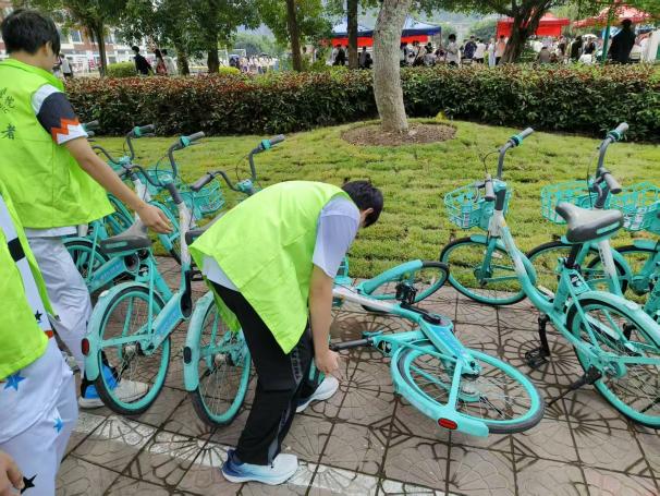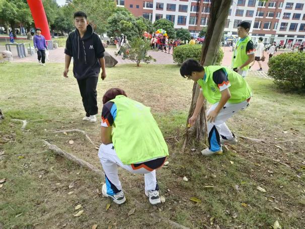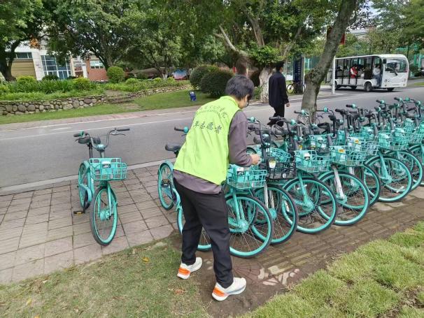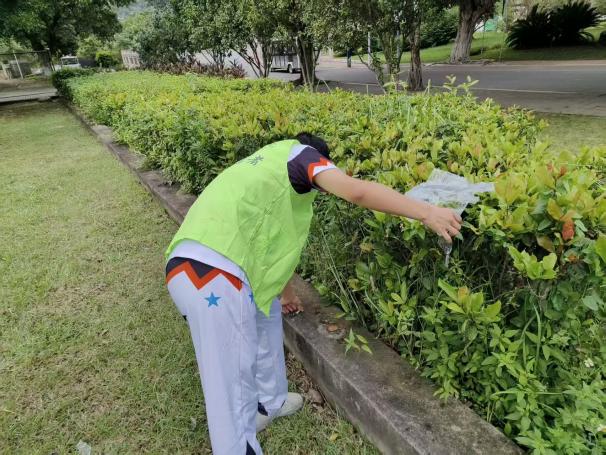 清洁行动中,身着荧光绿马甲的志愿者分工明确:有的穿梭于绿化带,清理灌木根部、草坪缝隙的烟头、纸屑,不留卫生死角;有的规整主干道、宿舍楼下的共享单车,按标准归位;还有的志愿者对步道、树下角落及宣传栏开展 “地毯式清扫”,擦拭污渍。