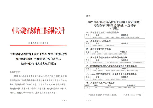 近日,中共福建省委教育工委公布了《2025年度福建省高校思想政治工作质量提升综合改革与精品建设项目入选名单》,我校7个项目获得省级立项(其中3个项目被推选至教育部参加全国评选)。